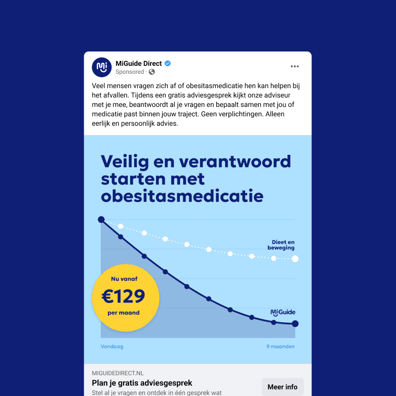 De propositie werd teruggebracht tot een merk dat vertrouwen, toegankelijkheid en regie uitstraalt. Vanuit daar kreeg MiGuide Direct een visuele identiteit en een website die het aanbod begrijpelijk maakt en uitnodigt tot actie. Met gerichte campagnes werd het merk stap voor stap verder opgebouwd en aangescherpt.